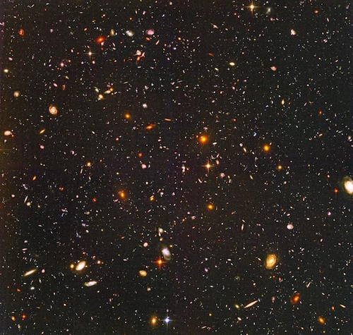 Every one of the points of light in this picture is a GALAXY. All different sizes, all different shapes, ranging from an estimated 50 million stars, to 100 trillion stars in size. There are approximately 10,000 visible galaxies in this photo, the most distant, nearly 13 billion light years away. And here’s the most amazing thing: