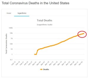 This is the linear line of fatalities as of yesterday when the United States ended the day with 8451 total deaths, an increase of 1350 from the previous day. As bad as that is, projections from just last week showed that we were on track to hit 10,000 deaths by the end of the day on April 4th. We’re probably going to hit that repugnant number tomorrow, but adding two days to the doubling time is a really good thing. It means—cautiously speaking—that the pandemic may be slowing.