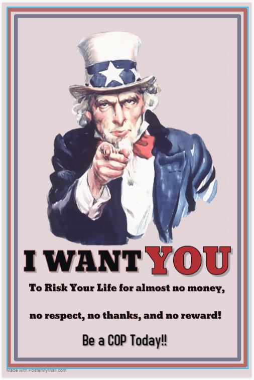 So, what do we need to reverse what is surely about to become a dramatic slide in the quality of police departments at a time when they need, more than ever, solid, intelligent, motivated, quality cops with pure motives and unimpeachable ethics? We need you to join the police force. Who? You. The reader. I’m speaking to you. If you would have to be an absolute idiot to want to go into the policing profession right now, that is precisely why the profession needs you. If you’ve read this far, you have either incredible patience, a high tolerance for suffering, or an insatiable thirst for growth and knowledge, and all of those things are critical virtues for a police officer to possess. If, like me, you’ve seen the dangers of a degrading candidate pool for a public position where the actions of one bad cop can taint the motives and accomplishments of thousands, then your local police department needs you. This is the time when you can give back to society. If you’re intelligent, successful, good under pressure, and have a solid moral compass, why not consider leaving whatever your current profession is and giving back to your community by joining the police force?