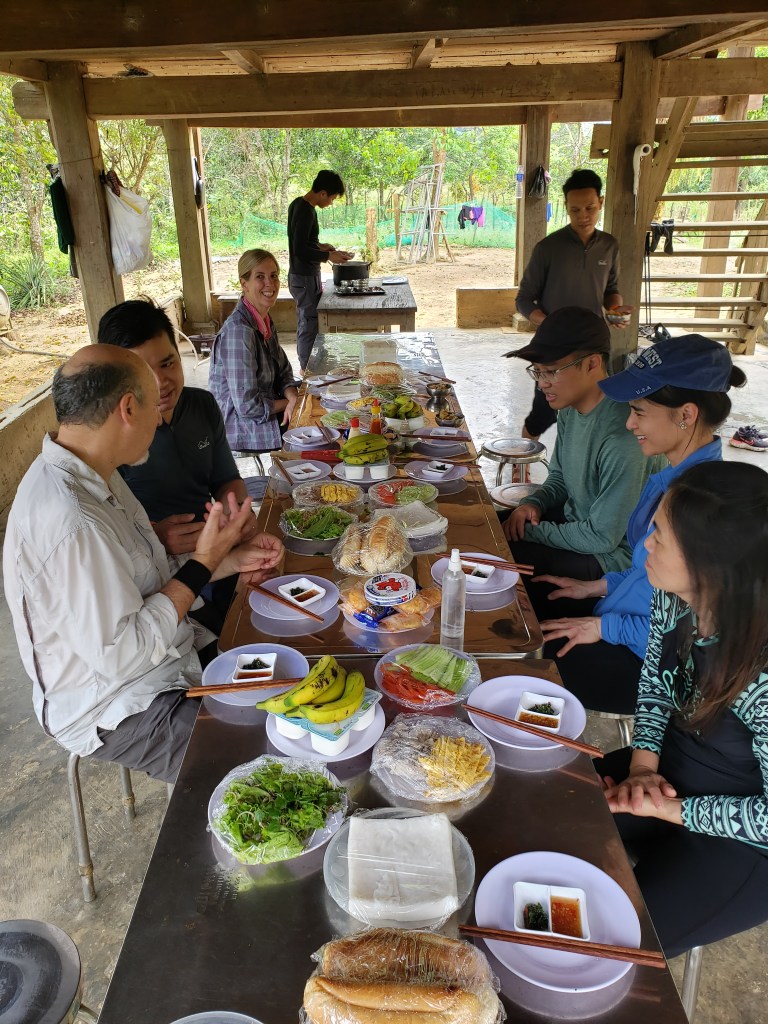 The tour doesn’t officially end at the roadside, though it may feel that way. The price includes a stay that night in a beautiful bungalow at a place called Chay Lap Farmstay, where the ten of us gather for a last supper with our guide Tha Tran, and our safety specialist Hieu Ho. The dinner is wonderful, and afterwards we take another group picture and then Tha and Hieu hand out wooden medals to commemorate our trek.